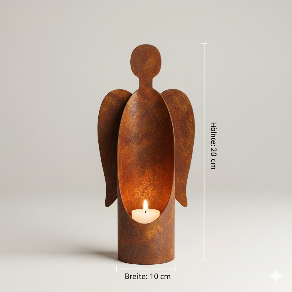 Der Engel ist ca. 20 cm hoch und damit ideal für Fensterbänke, Sideboards, Gartentische oder Eingangsbereiche. Kompakt genug für Innenräume – groß genug, um ein sichtbares, warmes Lichtspiel zu erzeugen.