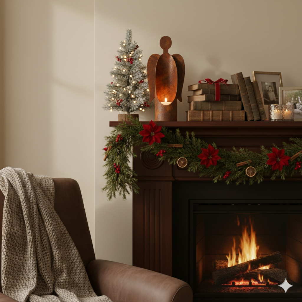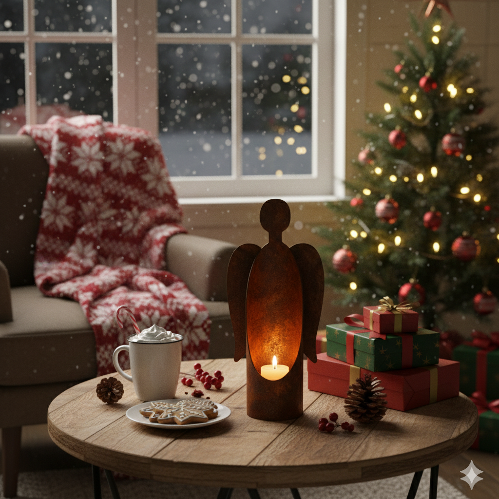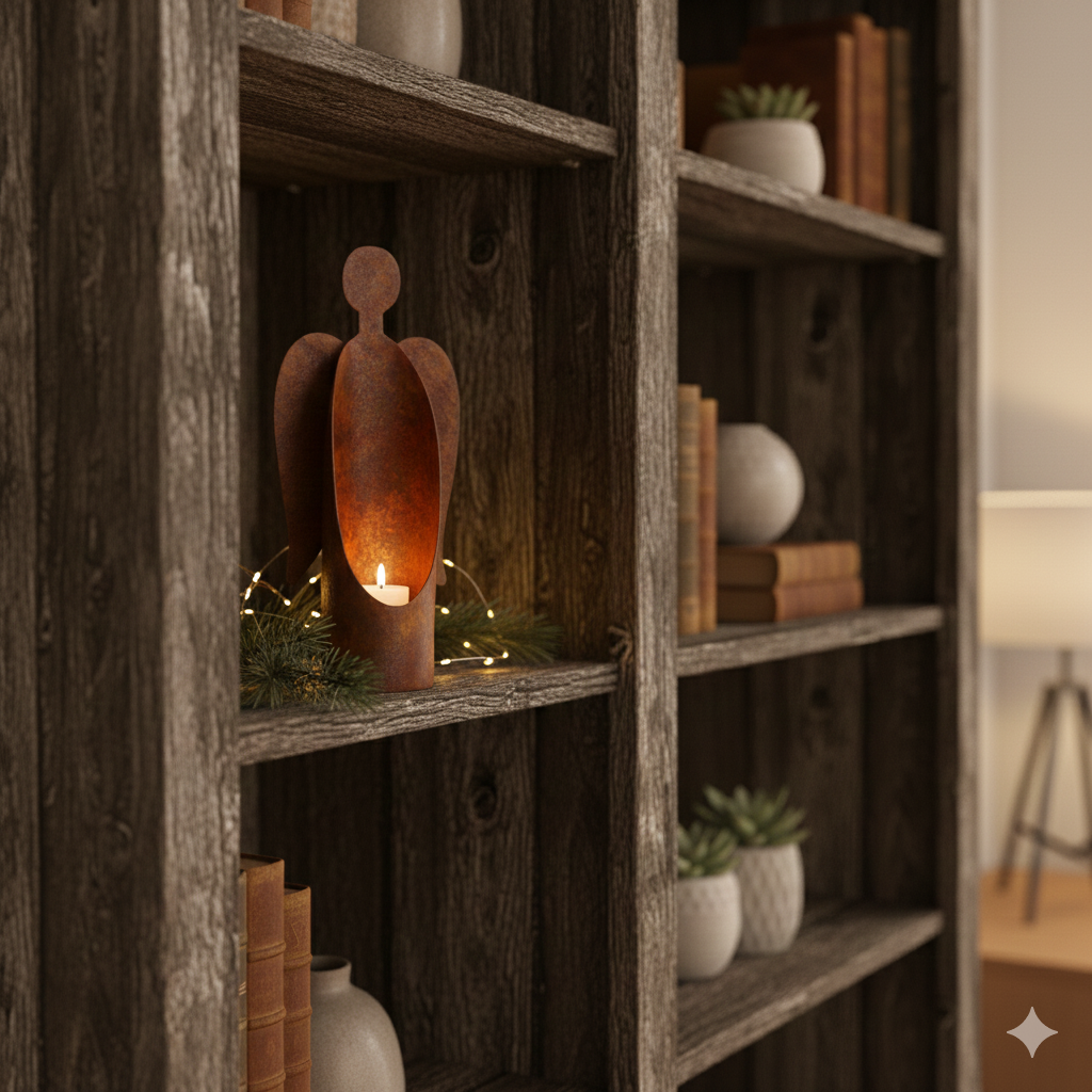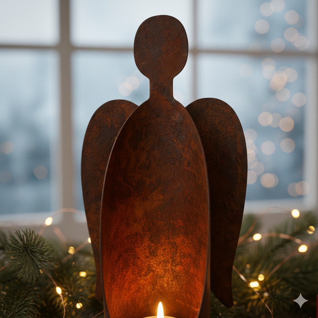 Dieser rostige Engel ist ein handgefertigtes Kunstwerk voller Charakter. Mit seinem warmen Licht sorgt er sofort für festliche Gemütlichkeit – perfekt als Geschenk oder für deine Weihnachtsdekoration.